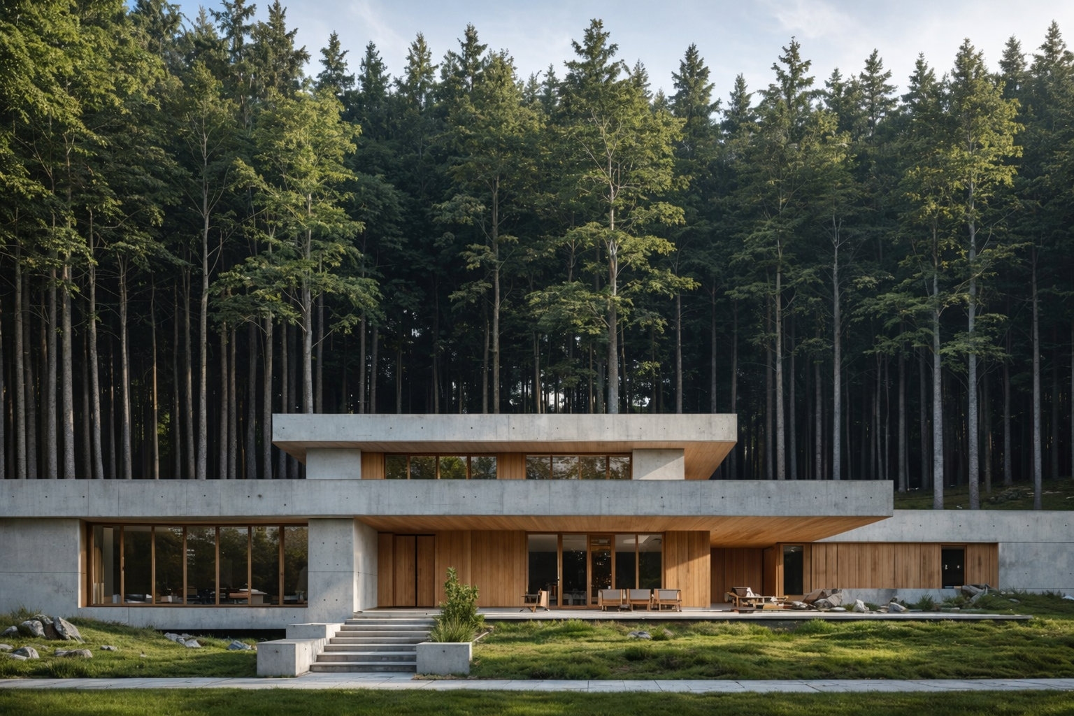 The house is structured through a clear vertical sequence, where each platform hosts a specific program. The lower level integrates an indoor pool embedded into the landscape, the intermediate platform contains the main social area designed for gatherings and openness, and the upper level accommodates the private living spaces, intentionally separated to ensure comfort and functionality. This layered organization reinforces both circulation clarity and spatial hierarchy.